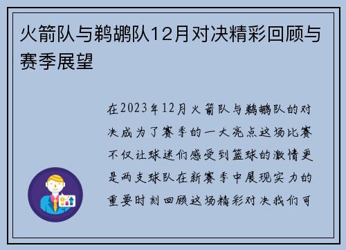 火箭队与鹈鹕队12月对决精彩回顾与赛季展望