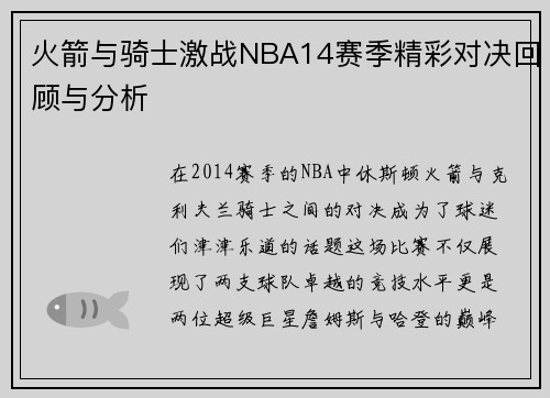 在2023年12月,火箭队与鹈鹕队的对决成为了赛季的一大亮点。这场比赛不仅让球迷们感受到篮球的激情,更是两支球队在新赛季中展现实力的重要时刻。回顾这场精彩对决,我们可以从比赛的过程、球员表现、战术分析以及未来展望四个方面进行深入探讨。火箭队以其年轻化的阵容和积极进攻风格,逐渐找到了节奏,而鹈鹕队则凭...